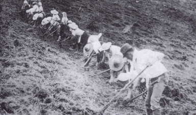 山頂を平らにする作業で鍬で掘る。石を転がす。