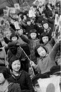 鉄だけてなく、アルミニウムも供出。各家庭から集めたナべ、カマ類を運ぶ 札幌の国民学校の学童たち。