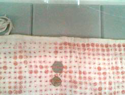 赤い糸で一針づつ結び目を作りました。又、トラ年生まれの人は年の数だけ結び目を作れました。
