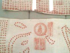 身内に出征者がいないため、直接作ることはしませんでしたが、縫ってお手伝いはよくしました。筆の背で千の丸印をさらしにして赤糸で縫い込んでいきました。寅年生まれの人は年齢の数だけ縫う為重宝がられました。玉結びをしていたがシラミの巣になるらしく、後に半返し縫いにしました。