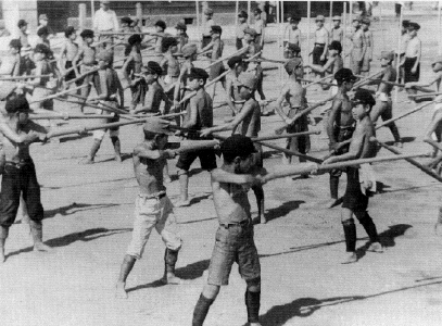 中等学校生徒は勤労動員の義務を負つた。最初は年間3〜5日(l3年)、l6年に年30日、l8年には4年生以上は年3分のl以上と拡大。農業主体の北海道は援農となり、学徒動員に至らぬ国民学校の "少国民" も本土決戦に備えて銃剣道の集団訓練を受けた。 (写真は札幌市教育委員会所蔵)