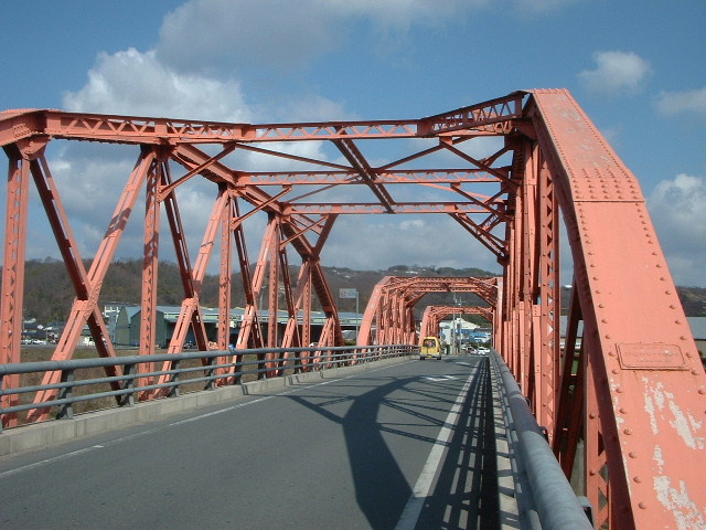 七日市と西江原にかかる「日芳橋」。 真っ赤な色のこの橋を渡り、西江原町新町へ。 新町(しんちょう)にはいるとすぐ左折する。 まもなく興譲館高校を左に見て神戸(こうど)というところになる。 |