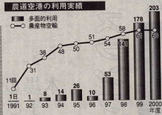 イベント利用25日増 農産物空輸横ばい 笠岡湾干拓地の農道離着陸場(農道空港)の2000年度の利用実績が15日、井笠地域の2市7町で構成する同農道離着陸場運営協議会が開いた総会で、報告された。 本来目的の農産物空輸での利用が前年度並みの35日、計60回にとどまったのに対し、イベントなどの「多目的利用」は前年より25日増え203日に上った。 軽飛行機を使って空輸された農産物は、計3.3トン(前年度3.7トン)。内訳はラークスパー(千鳥草)1.4トン(1.4トン)桃1.2トン(0.7トン)有機無農薬野菜0.2トン(0.8トン)など。 空輸先は、岡山空港が48回と大半を占め、積み替えて定期便で東京へ出荷された。 運送費はほぼ県補助金で賄われているが、積み替えの不便もあって伸び悩んでいる。 一方で多目的利用は増え続け、ラジコン飛行機の大会や練習での使用が計129日(84日)、県警と消防ヘリの訓練が22日(27日)。ジャイロプレーンなどのスカイスポーツは、死亡事故があったことなどから14日(31日)に半減した。マラソン大会や自動車のテスト走行などの利用もある。 今年3月から始めた遊覧飛行は、4月末までに23組69人が搭乗した。 協議会では、引き続き多目的利用の促進をPRし、イベント誘致を図ることや9月30日に開港10周年記念イベントを開くことを決めた。 |