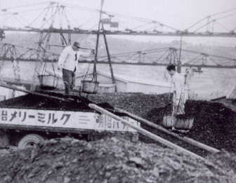 笠岡港・港で船から降ろした石炭をトラックに積むためモッコでの作業