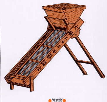 精白途中の糠やくずの混じった米を上に開いた口から入れ、斜めに固定した網の枠上を滑らせて落下させて分ける構造になっています。