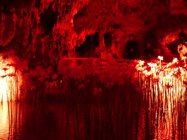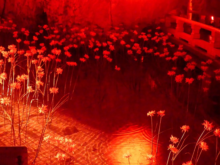 やがてライトアップがあり、その先に赤い蜷川ワールドともいえるアートが見えた。