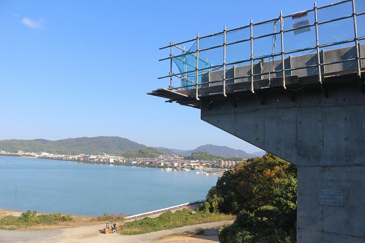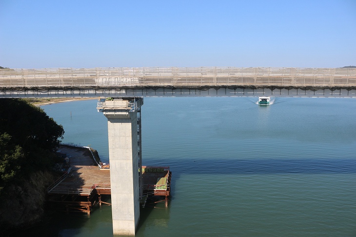 現在の神島から見た「新神島大橋」の工事。