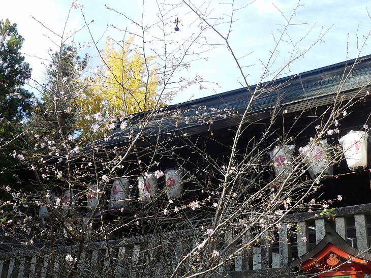 拝殿と神楽殿の間には「寒桜」が咲く。