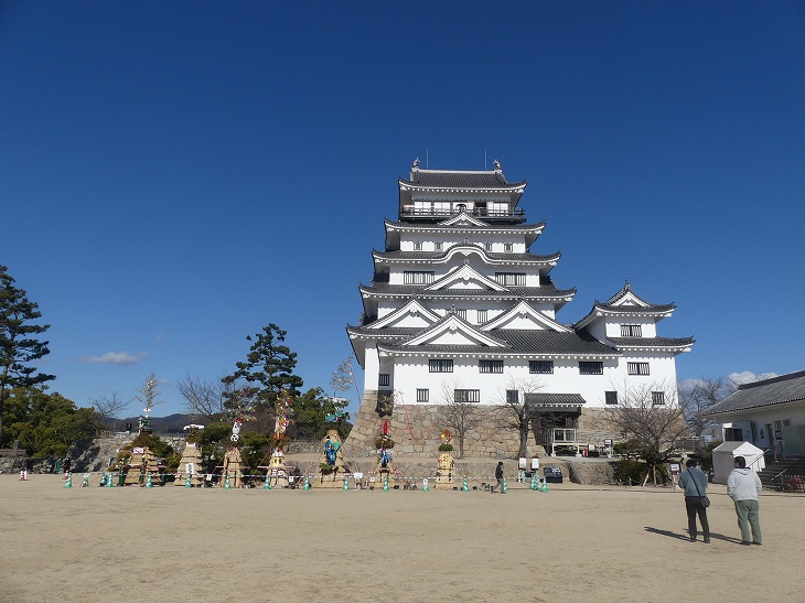 天守閣の前、七つの「とんど」が展示中。