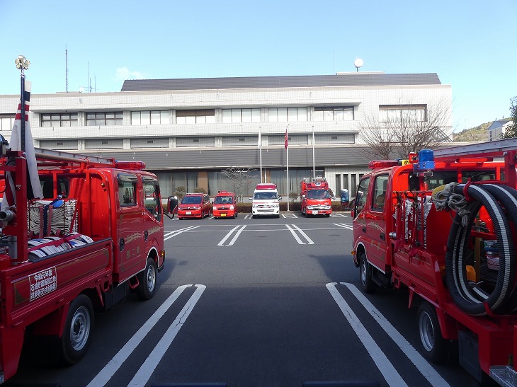 役場前を出た消防車は右と左に別れて、役場を去った。