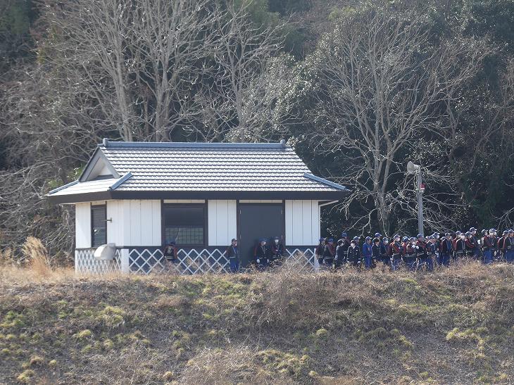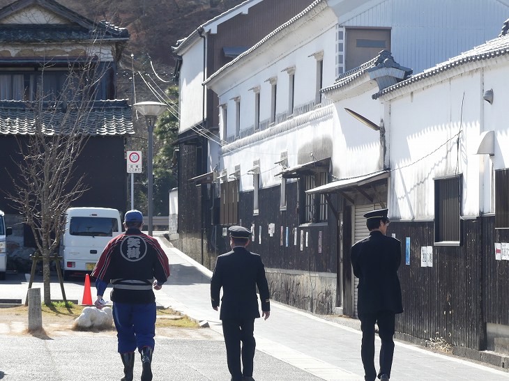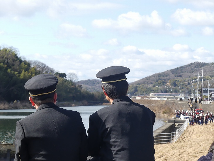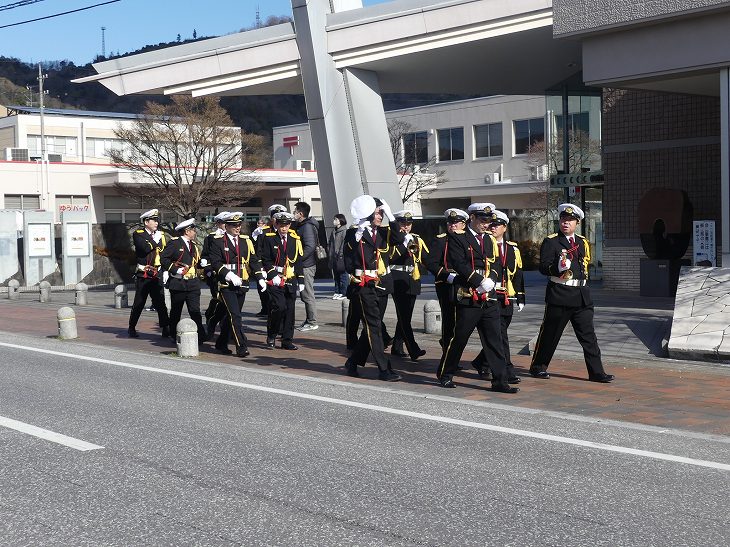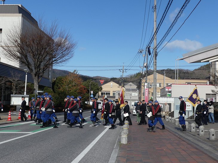 式典が終わり文化ホールから役場へ移動する消防団員。