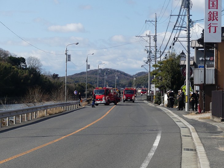 役場を出て右折した消防車は対岸の右岸に整列している。
