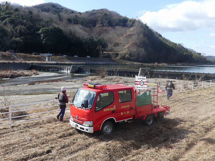 役場を出て左折した消防車が↓、小田川の左岸から河川敷に降りていく。