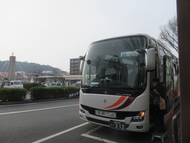 ラマルドボアで笠岡に着いた日本旅行のツアー客が観光バスに乗る。