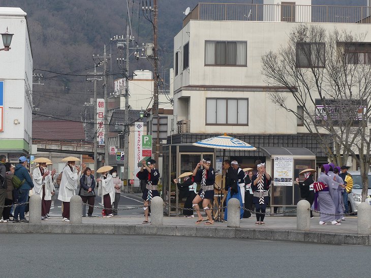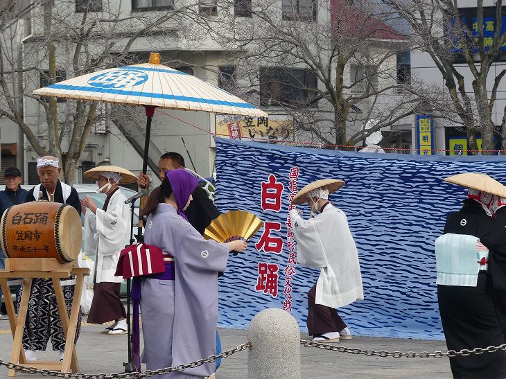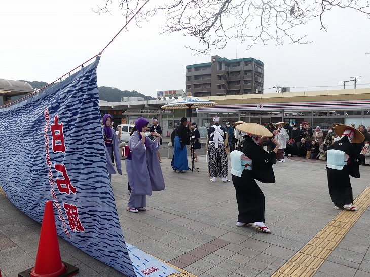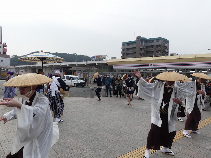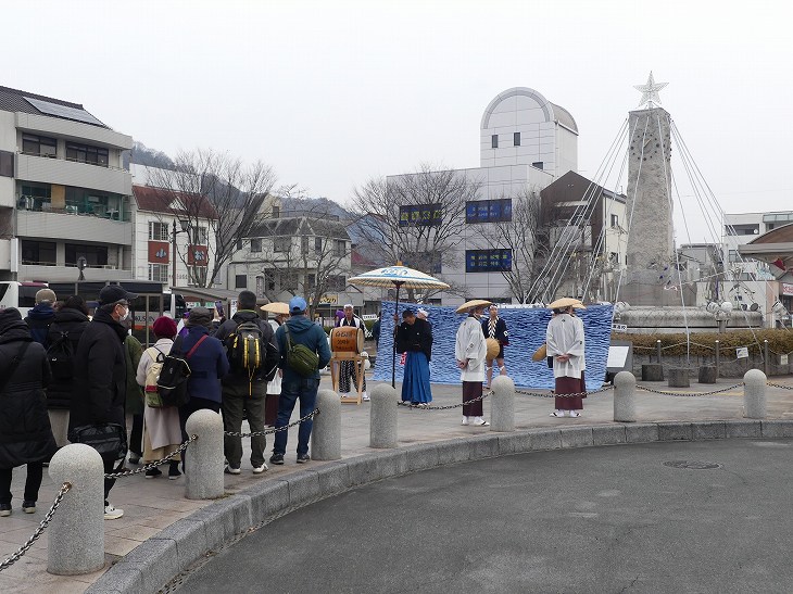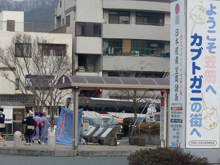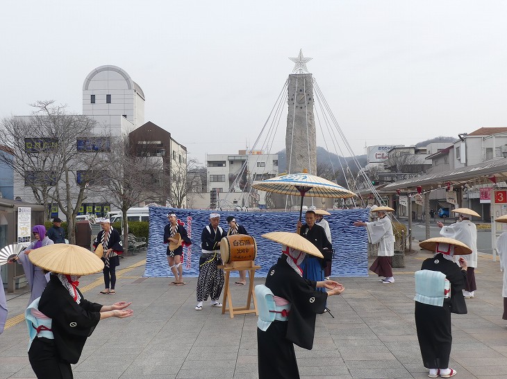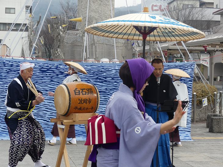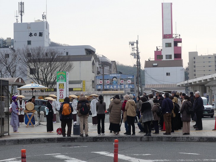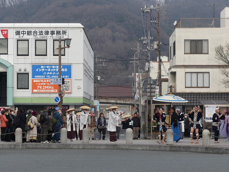 ツアー客は笠岡駅前広場の白石踊りの人形の前に集まった。