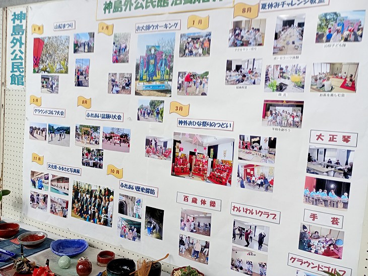 市民会館のホワイエ。講座などの活動を展示。