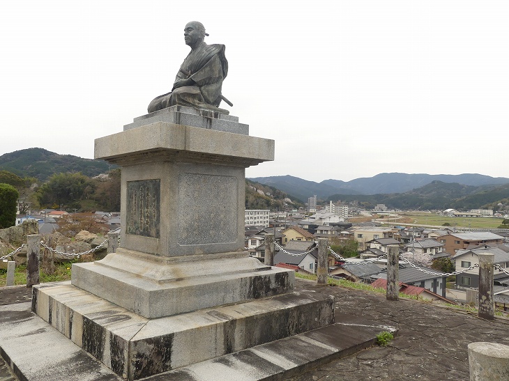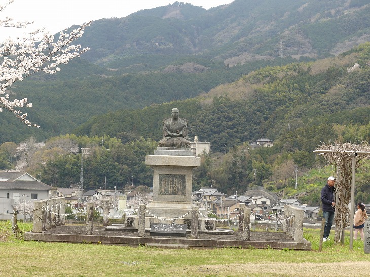 中江藤樹先生像の後ろ側には「肱川」が流れ、↑ 前には大洲城天守閣↓。