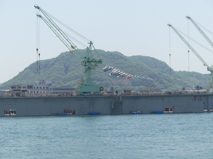 クレーンとクレーンを繋ぐロープに泳ぐ鯉のぼり。
