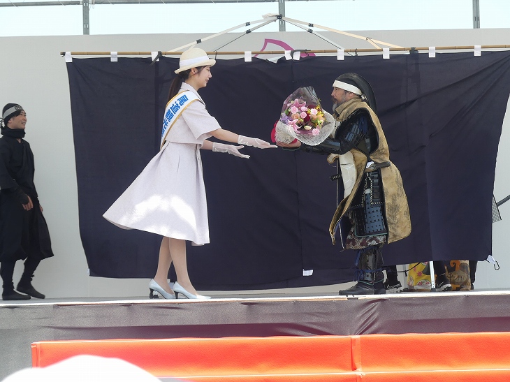 公演後、尾道観光大使から花束を受ける隊長さん。
