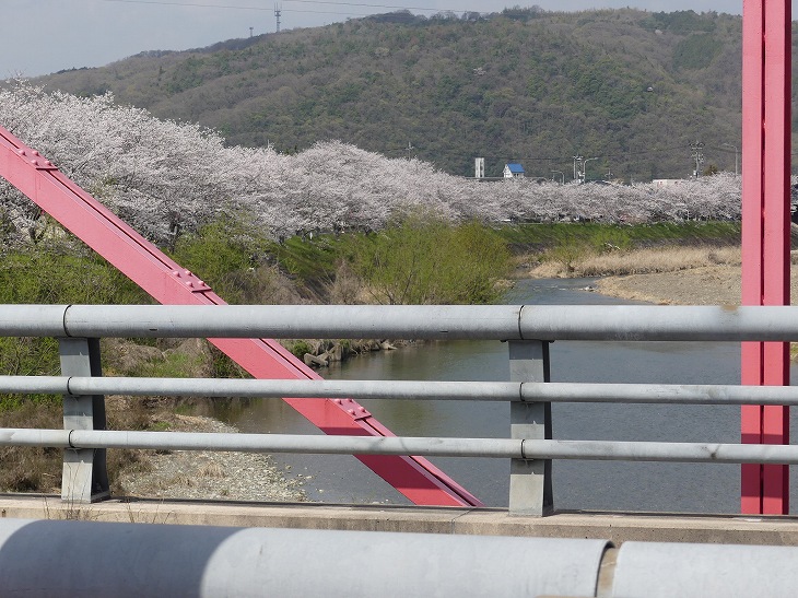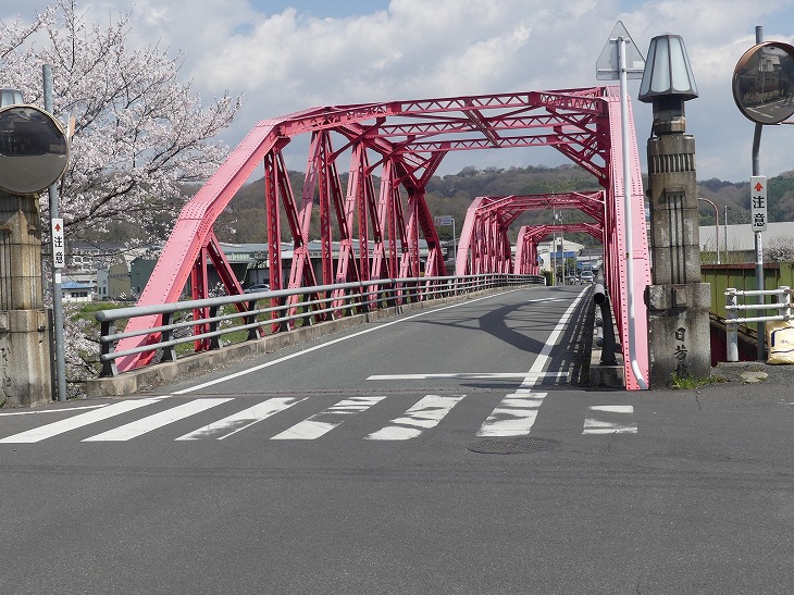 赤いトラス橋「日芳橋」をわたる。