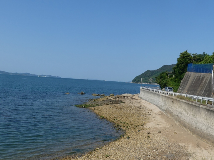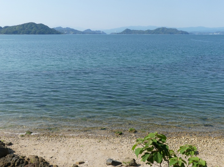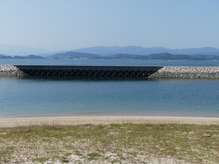 学校前の砂浜。波方の造船所が見える、正面高縄半島、左後方が四国山脈。