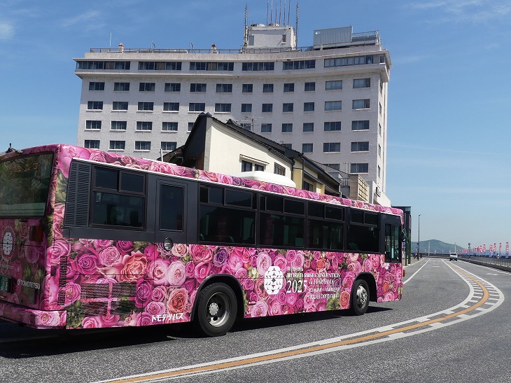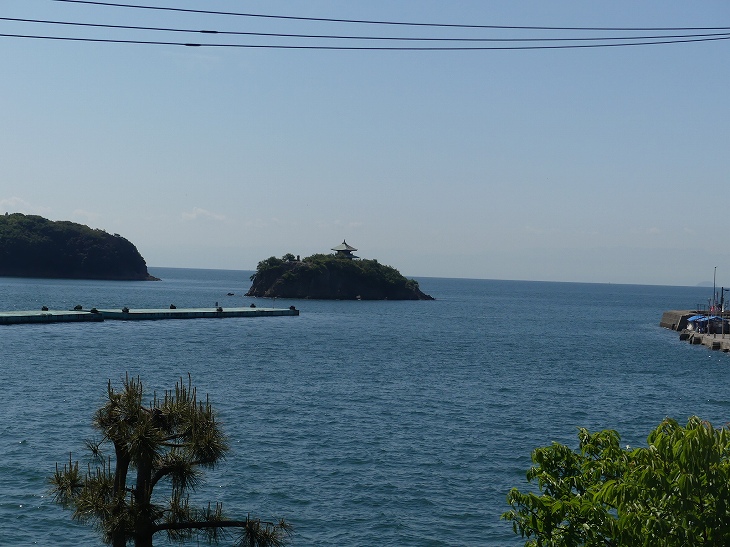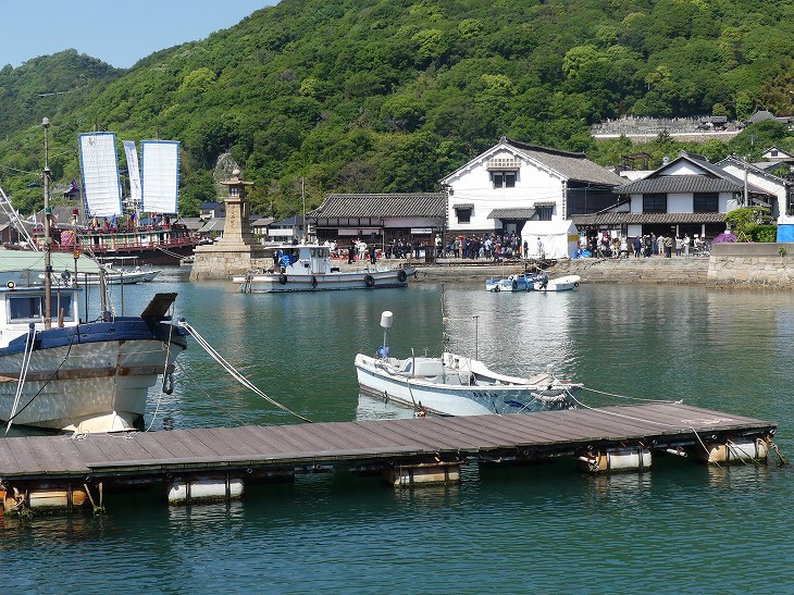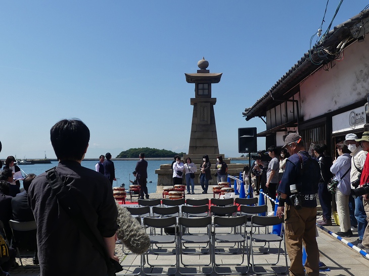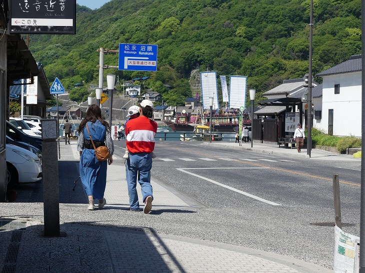 渡船場の駐車場前、前方に「朝鮮使節使」の船が見える。