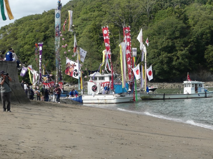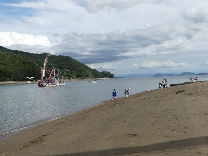 神社側からは人が多くて前が見えないので、砂浜に下りた。