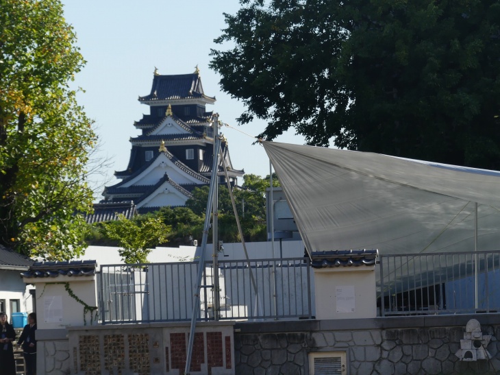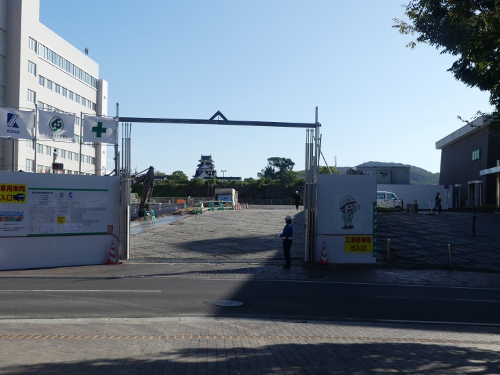 校門ふきんから市民会館解体工事と、正面岡山城、右にRSKラジオ山陽。