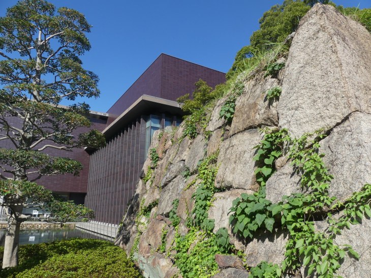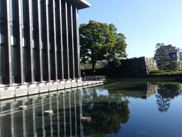 図書館と、岡山城内堀跡と外馬下門跡。