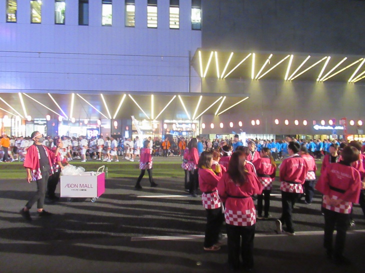 「おごじょ太鼓」は、同時に天文館・いづろ・山形屋の三カ所で行われる。