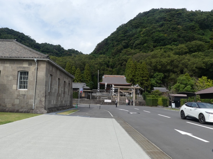正門の前は錦江湾で、今は日豊本線の電車が通る。