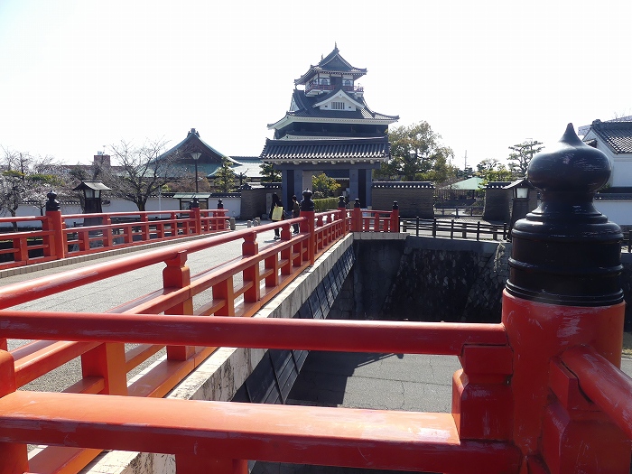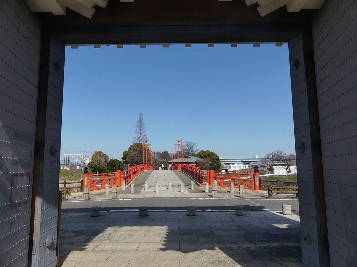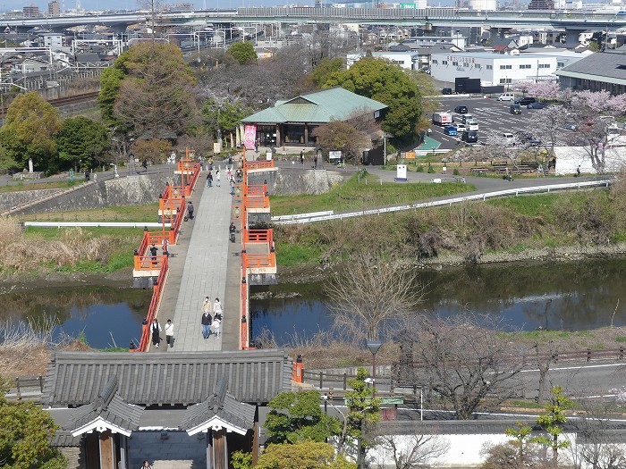 清州城の案内によく使用される橋と天守の風景。