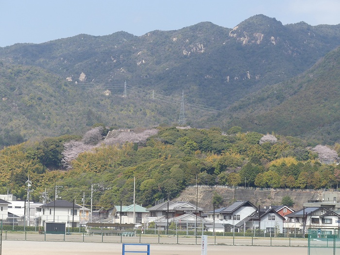 児童公園から見る亀居城と亀居城の桜。満開だ。