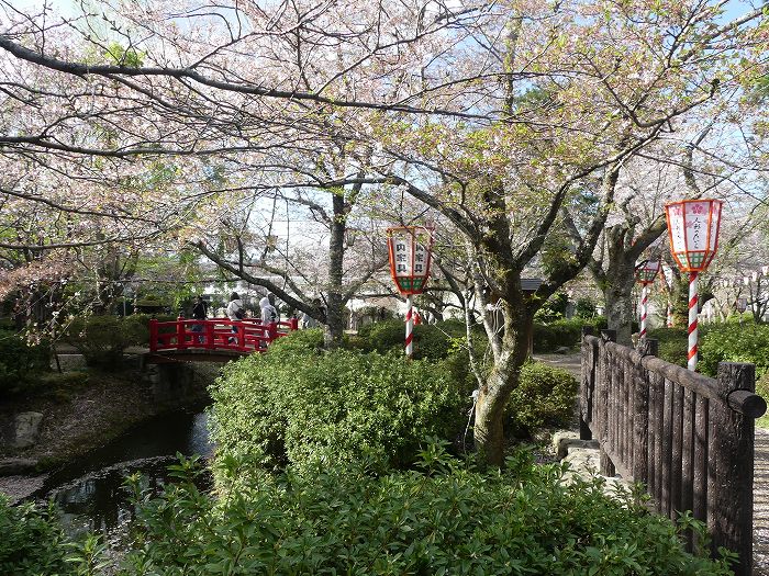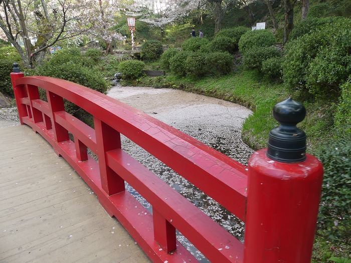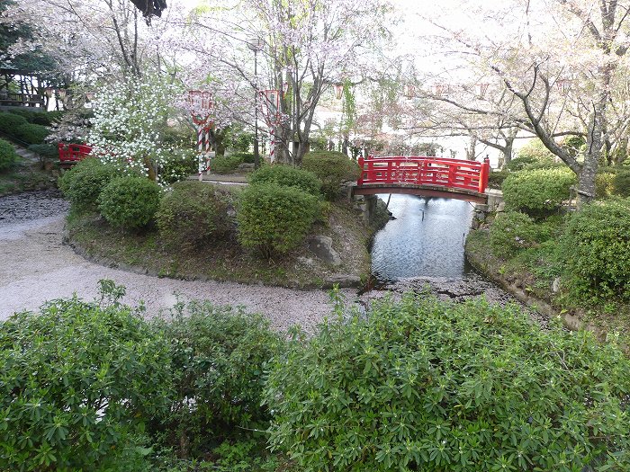 羽衣池には赤い橋が二本架かり、周辺はすべて桜。