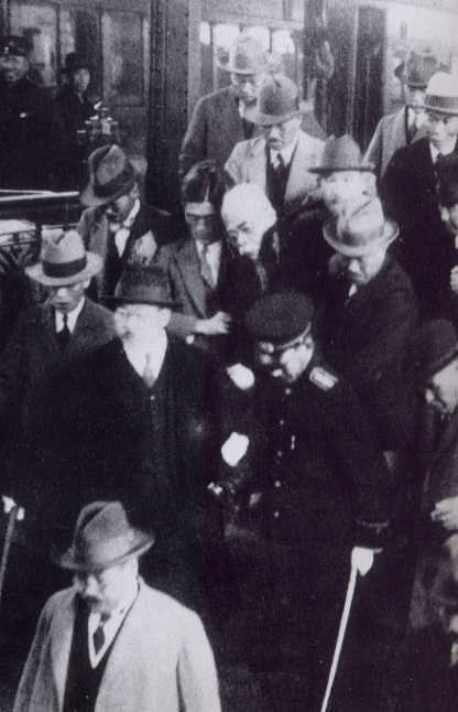 昭和5年11月14日、東京駅で浜口首相(中央)が狙撃され重傷を負った。以後「血盟団」などにより要人テロが続発した。