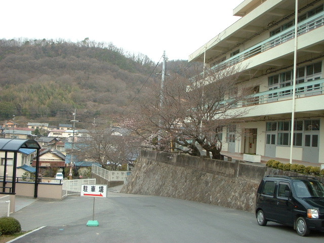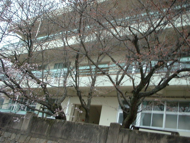 坂道から左手の桜を見ると既に一部花が開いていた。 去年創立100周年記念で建設された「千鳥会館」。 えいちゃん・長女・長男と3人が出身だが誰も寄付はしなかった。