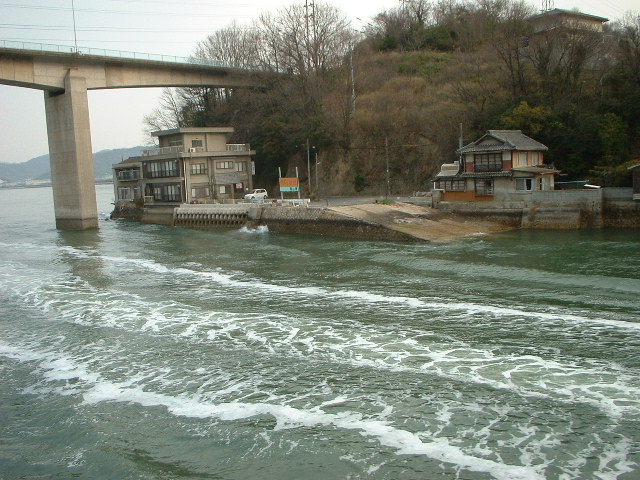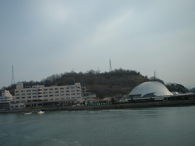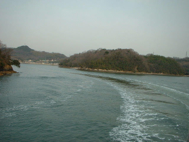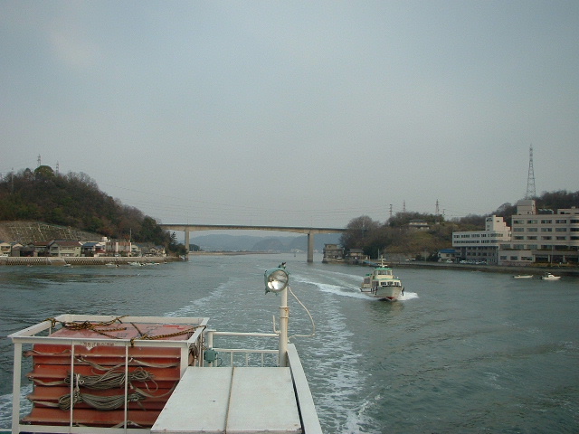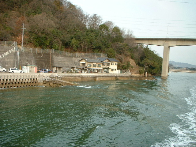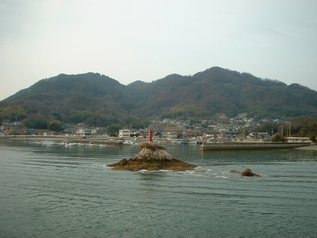 渡船場の神島側。 それが過ぎると五重の塔。 右手にはカブトガニ博物館と第一病院。 このあたり瀬戸内海国立公園だった。 「おおどんす」は本土と陸になり、「孫どんす」は神島になり、「小どんす」だけが島のまま。