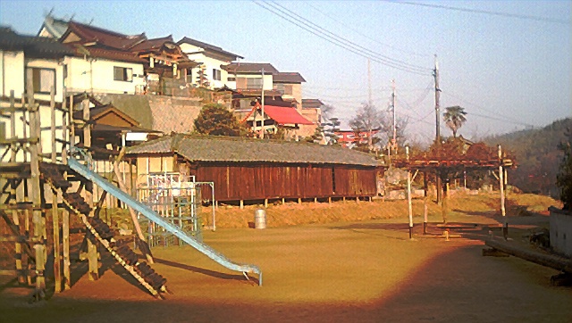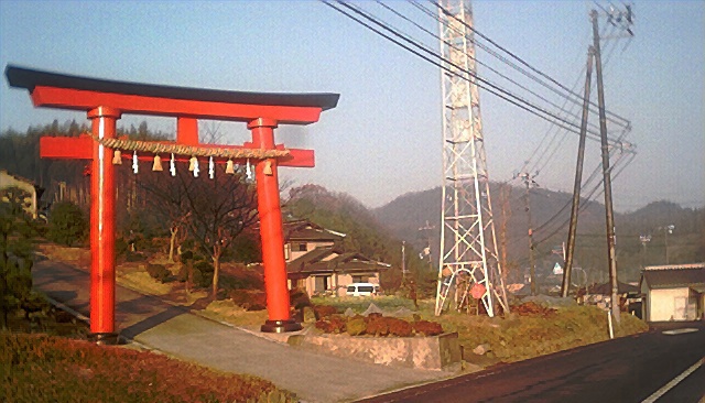 そこにはおおきな赤い鳥居があった。鳥居のねきには消防やぐら。