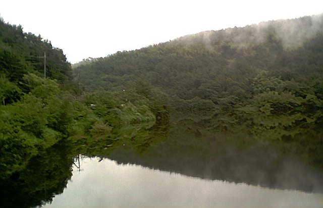 尾坂池の山には雲のような霧がかかっていた。