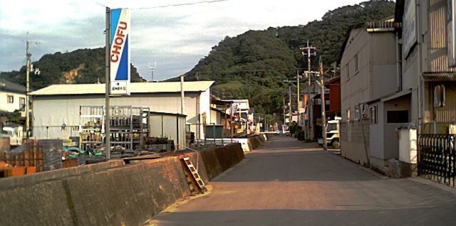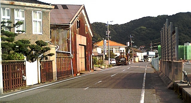 写真中央道路にコンクリート壁が見えるが、それが旧・堤防。左側は海だった。昭和40年頃までかな?
