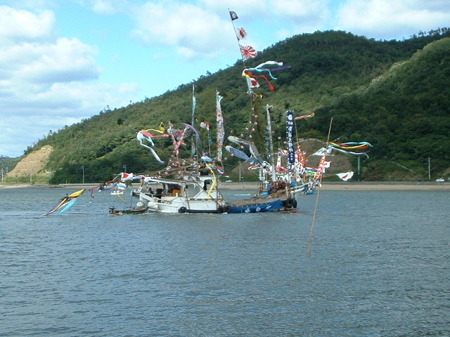 5月でもないのに船には鯉のぼり。
