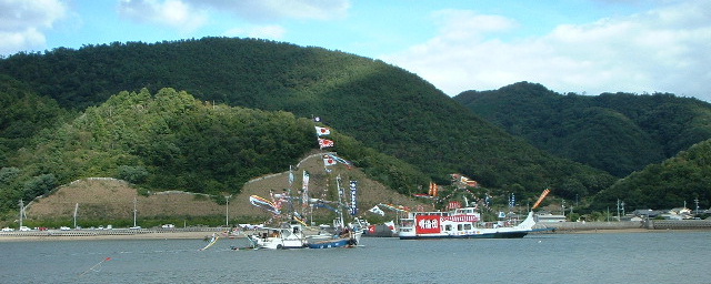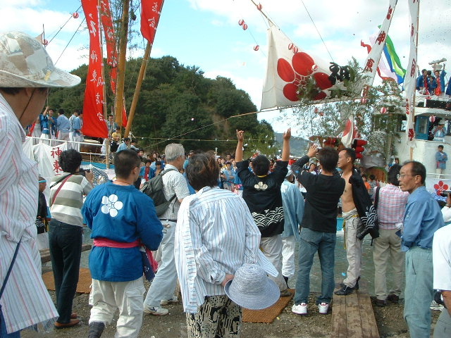 神島水道にはつぎの神輿と地区民を乗せた船が接岸を待っている。