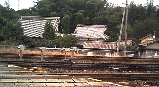 踏切の右手にはお寺、左手には踏み切りの番人小屋があり。