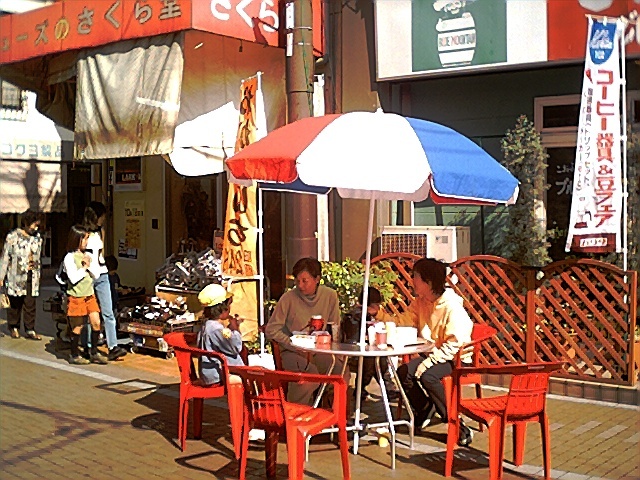 さくら堂の前には夫婦子供が座っているが若い夫婦は珍しい。