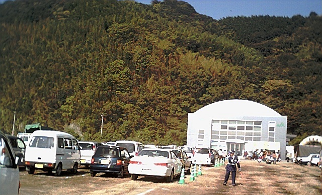 干拓地を笠岡方面に走っていくと向こうから車が次つぎと入り、曲がっている。そこが駐車場と会場。