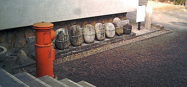 こんな重たそうなまるい石を並んで保存してあるところ、それが笠岡市立郷土館。