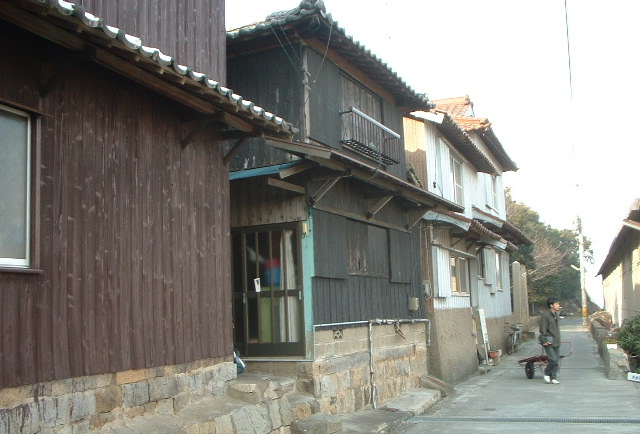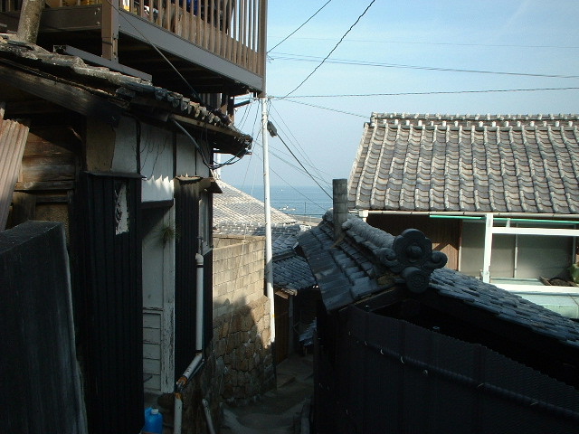 岩坪の海岸から上、横に狭い石段が曲がりくねって迷路のように続いたり途切れたり。