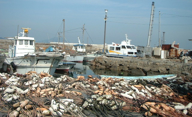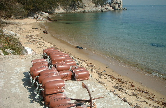 神社参道は海につづく、そこには蛸壺を干してあった。