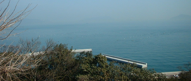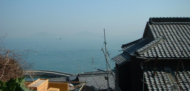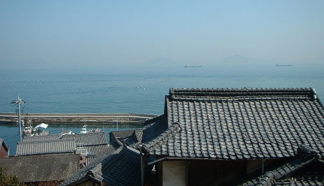 前浦。甍の向こうには内海航路を貨物船が行きかう。