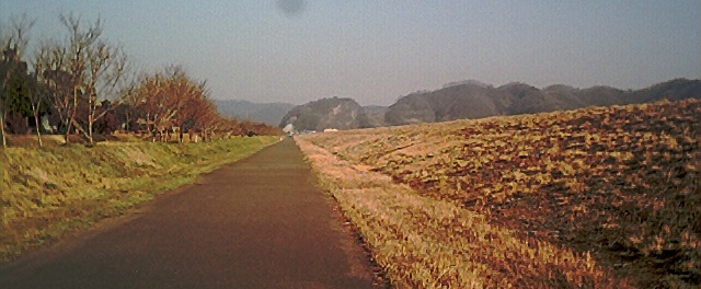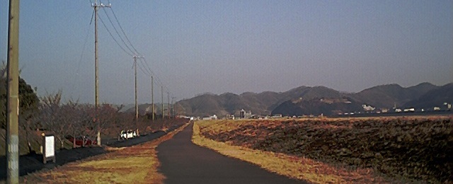 えいちゃんはこれから3キロあまりつづくこの笠岡湾堤防の桜の堤防を走るのだ!